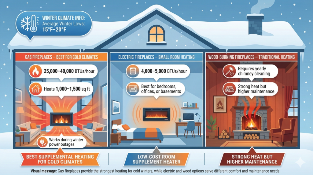 Gas fireplaces are the most capable supplemental heat source for Idaho winters. A direct-vent unit produces 25,000 to 40,000 BTUs per hour, sufficient to heat 1,000 to 1,500 square feet. According to the U.S. Department of Energy, zone heating with a high-efficiency gas fireplace can reduce whole-home heating costs when you lower your central thermostat in unoccupied rooms. Gas fireplaces also operate independently of the electrical grid, which matters during Idaho’s winter power outages.