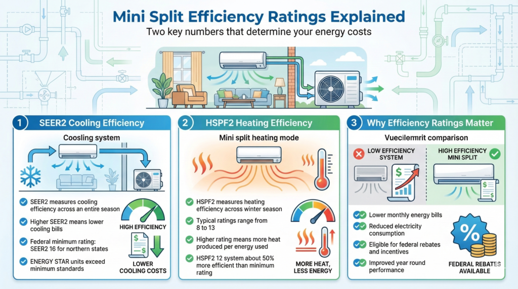 Two efficiency ratings determine a mini split’s operating costs one for each season. Both are measured under updated federal standards that took effect in 2023. Checking both numbers before purchasing ensures the system qualifies for available rebates and delivers real savings year-round.